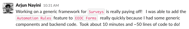 Hereâs an impromptu quote from Arjun in our company Slack of what itâs like to build a feature at Ashby: